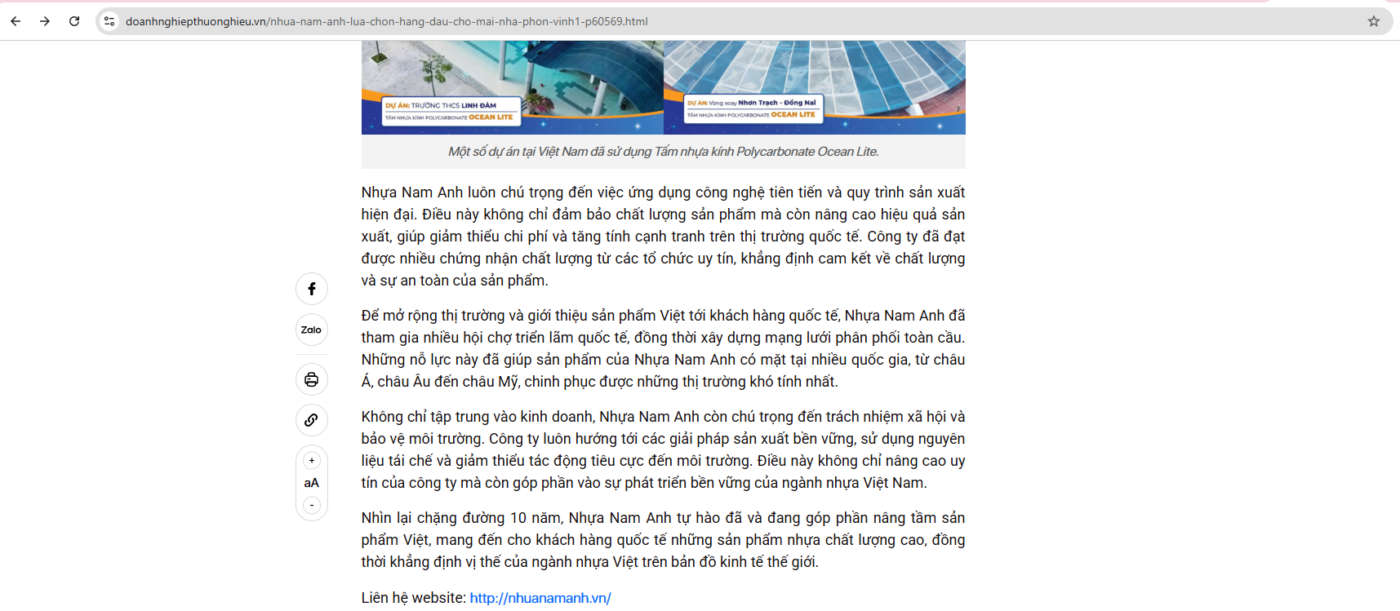 Đặc biệt, chúng tôi rất tự hào khi Ocean Lite – sản phẩm tấm nhựa kính Polycarbonate cao cấp của Nam Anh Plastic – được nhắc tới trong bài báo như một giải pháp tiên tiến, được người tiêu dùng tin chọn và góp mặt trong danh sách các thương hiệu phát triển nổi bật năm 2024. Sự ghi nhận này không chỉ phản ánh nỗ lực cải tiến chất lượng sản phẩm mà còn khẳng định cam kết của chúng tôi trong việc đóng góp cho sự phát triển bền vững của ngành công nghiệp nhựa Việt Nam.