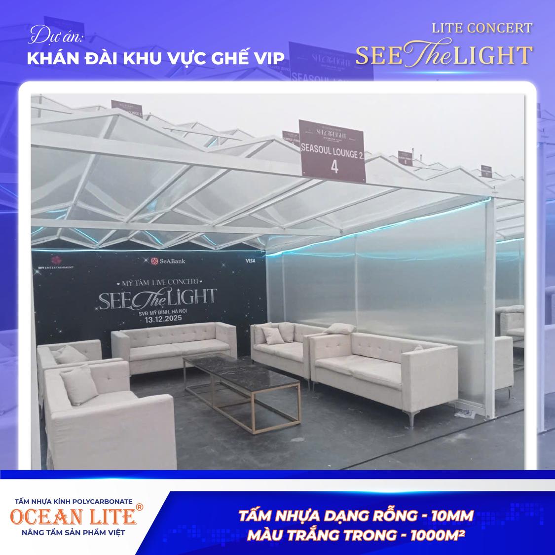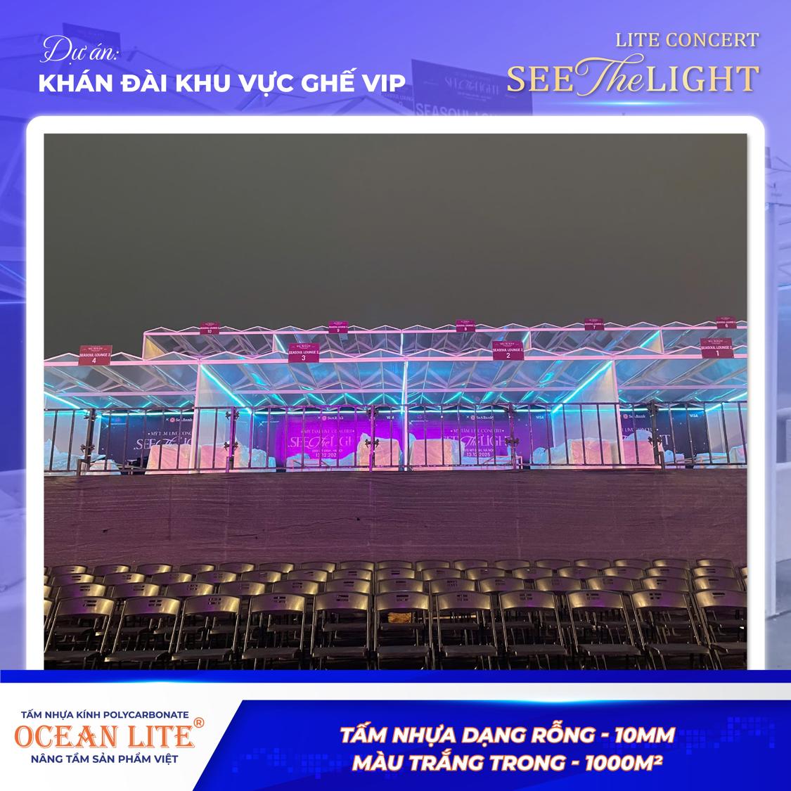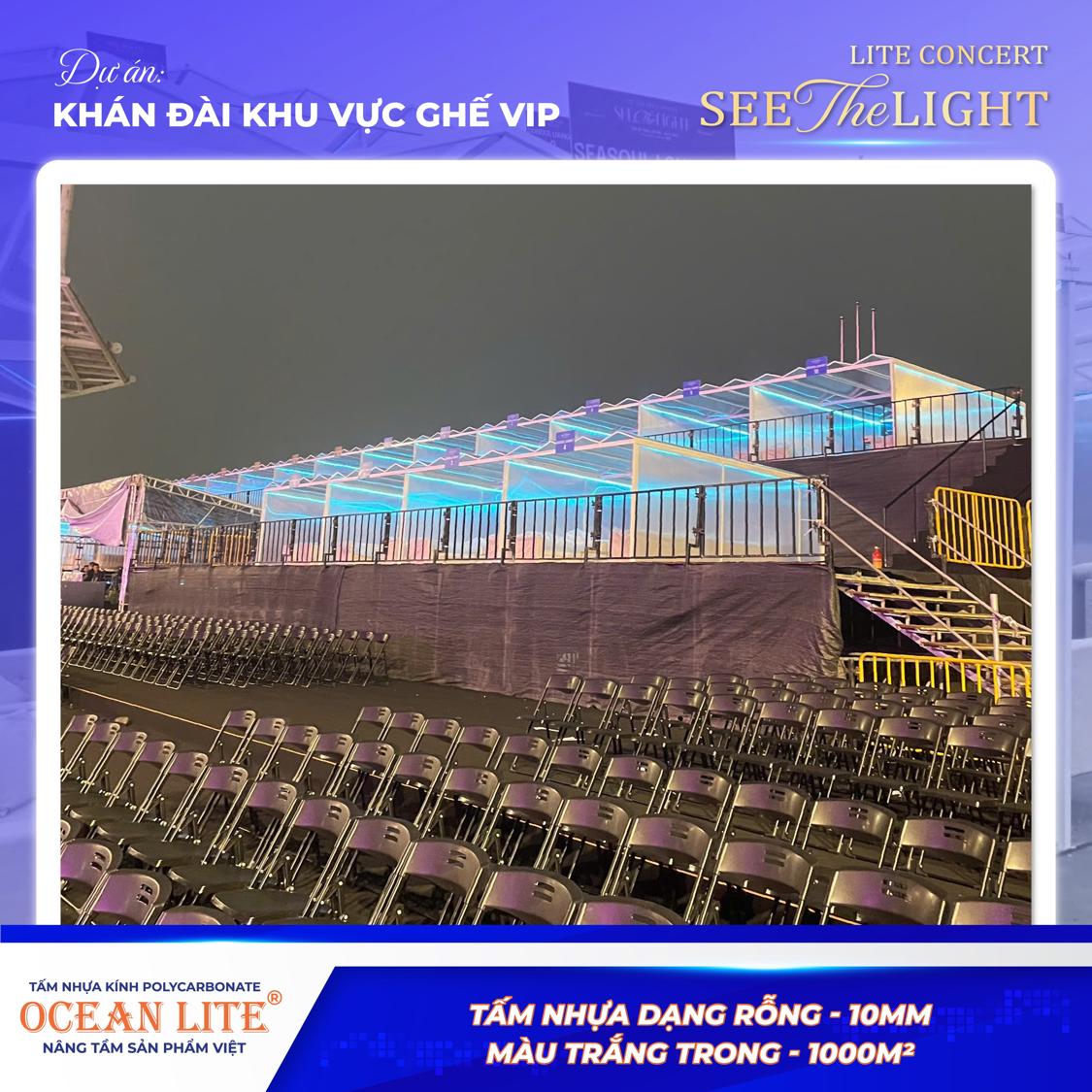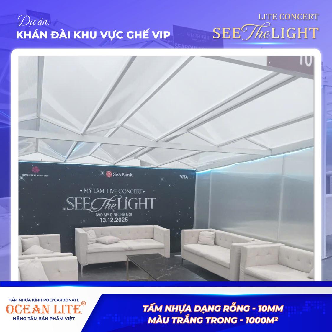 Tấm Polycarbonate rỗng Ocean Lite sở hữu khả năng xuyên sáng tinh tế, giúp mái che hòa quyện hoàn hảo với hệ thống ánh sáng sân khấu hiện đại. Dưới tác động của ánh đèn, không gian khu vực VIP trở nên lung linh, sang trọng, góp phần tôn vinh tổng thể thiết kế của concert “See The Light”.