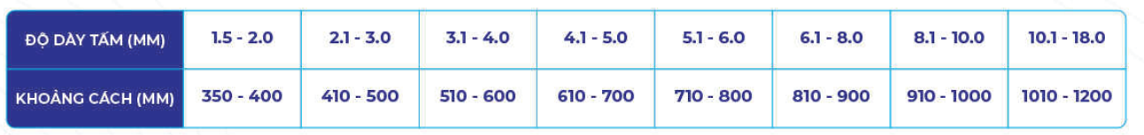 + Với tấm độ dày từ 5–10 mm, khoảng cách nên là 700mm – 1010mm