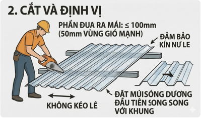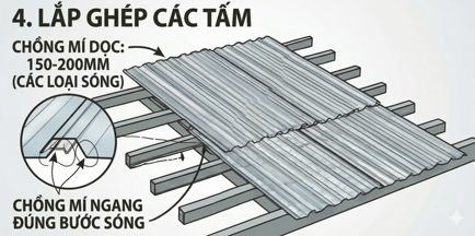 - Chồng mí theo chiều dọc: 150–200mm tùy loại sóng. Múi dương đầu tiên của tấm sóng mới chồng lên múi dương cuối cùng của tấm sóng dưới