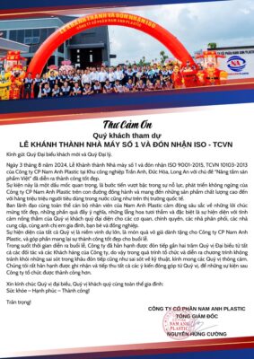 Xem thêmLỄ KHÁNH THÀNH NHÀ MÁY SẢN XUẤT TẤM NHỰA POLYCARBONATE NAM ANH PLASTIC – THƯ CẢM ƠN